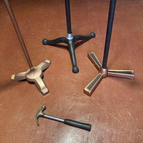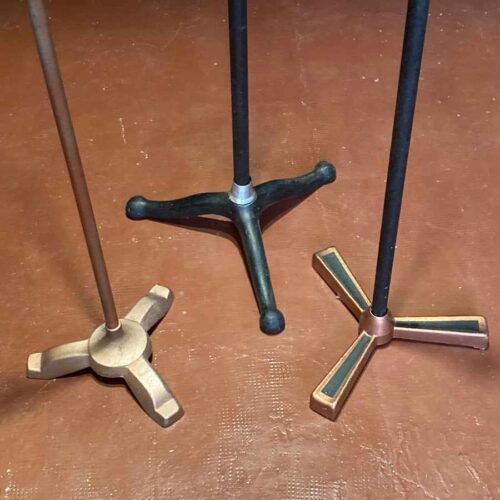 Atril de locutores de radio de las décadas de 1930 y 1940, pieza emblemática del inicio de la radiodifusión en directo. En torno a estos atriles se organizaban narradores, músicos y técnicos de efectos, compartiendo en ocasiones un único micrófono mientras daban vida a noticias y seriales. Un elemento esencial para ambientar estudios de radio antiguos o rodajes sobre la edad dorada del sonido.