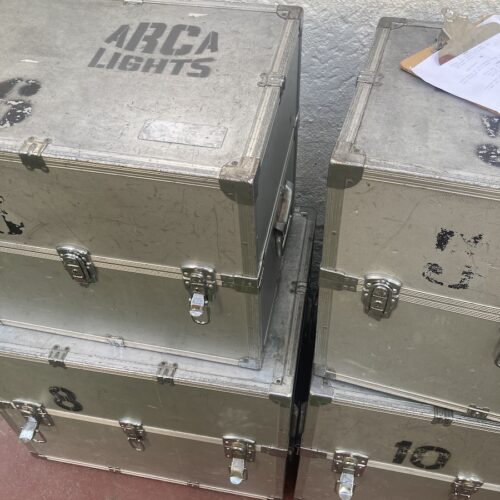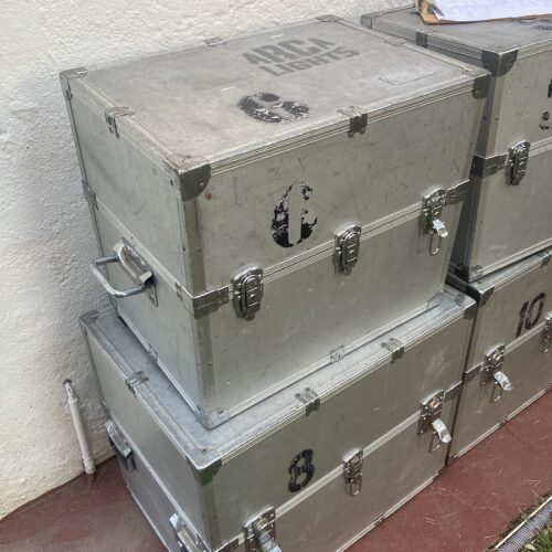Lote de tres cajas técnicas auxiliares de los años 60-70, fabricadas en madera pintada en rojo con cantoneras metálicas. Eran usadas para transportar material de iluminación, sonido o accesorios en rodajes y teatros. Precursoras de las actuales flight cases, reflejan el trabajo diario de los equipos técnicos de la época.