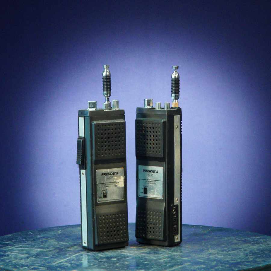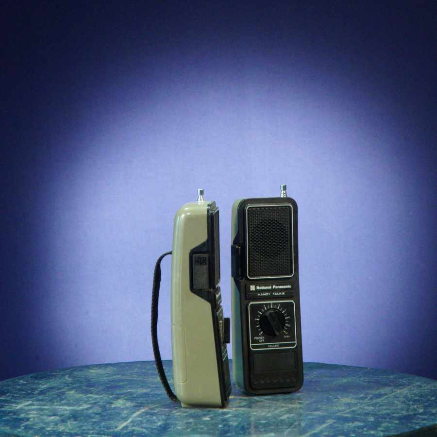 Los walkie talkies color naranja de los años 80 destacan por su diseño llamativo, grande y contundente, ideales para remarcar la presencia de la comunicación inalámbrica en cualquier puesta en escena.